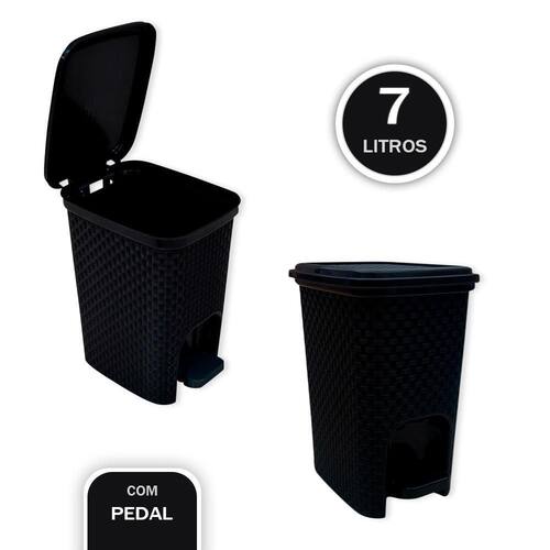 Lixeira com Pedal Trama Rattan 7 litros Preta Lixeira com Pedal 07 Litros A lixeira de 07 litros pode ser utilizada em qualquer ambiente, seja em casa ou no trabalho. produto em plástico resistente, texturizado com efeito de tramas. Fácil de limpar, pode ser molhada e usar seus produtos de limpeza sem medo, pois não perde a cor. A tampa é acionada através do pedal, basta pisar no pedal para acionar o levantamento da tampa.