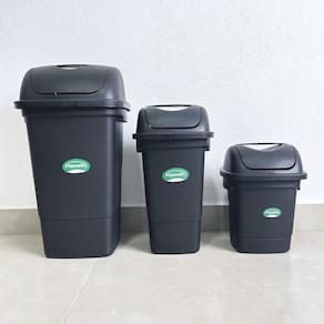 A Lixeira 30 Litros Plasvale possui tampa basculante e alça que facilita o manuseio, além de pegas nas laterais no formato dos dedos que auxiliam no seu transporte.