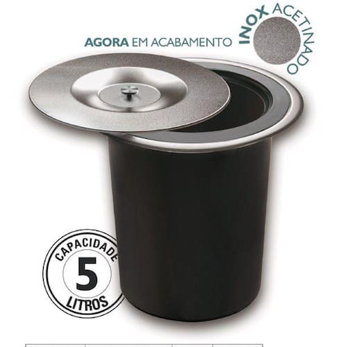 LIXEIRA DE EMBUTIR EM INOX ACETINADO COM BALDE PLASTICO DE 5LLixeira embutir inox ACETINADO Debacco 5 litrosLixeira doméstica de embutir, ideal para aplicação em granito, marmóres e demais superfícies. Balde removível para facilitar a retirada do lixo. A lixeira de embutir proporciona uma instalação rente a pedra oferecendo maior facilidade na sua utilização.Tampa em aço inox 304 ACETINADOBalde Plástico PPCapacidade: 5 litrosMedidas Externas: 200MM DIAMETRO x 220 mm ALTURAConteúdo da Embalagem: 01 Lixeira de Embutir na Bancada 5 litros - 20.03.20505 Temos dosador de detergente e outros tipos de lixeiras CONSULTE-NOS AGORA !!!!!!!!!