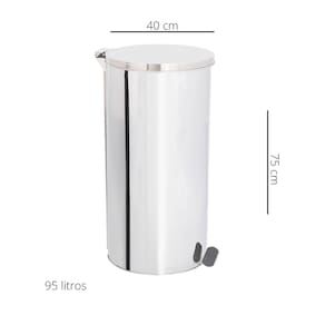 Material: Aço inoxidável de alta qualidade, resistente à corrosão e fácil de limpar. Capacidade: 95L Dimensões: 40x75 Design: Acabamento polido sofisticado e moderno. Peso: Leve e fácil de transportar. Tampa: PedalVendido por WINNETMETAIS e entregue por Casas Bahia