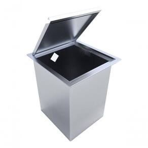 Tampa e moldura de acabamento totalmente em aço inox AISI 304, tampa com exclusivo sistema articulado, balde de 5 litros em aço inox AISI 430, sistema com ladrão para odor.