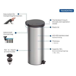 Para manter a organização e a limpeza da sua casa, sem abrir mão da beleza e do estilo, conte com a lixeira Tramontina New em aço inox 30 litros. Desenvolvida com um design especial, ela tem corpo produzido em aço inox e tampa em polipropileno preto, características que a tornam uma lixeira versátil e ideal para os ambientes mais variados. Ela ainda é muito prática, tem alça para transporte e não necessita de balde, basta inserir o saco plástico e prender na sua lateral. Sua tampa não encosta na parede no momento da abertura, o que evita marcas e eventual desgaste. Escolha Tramontina e garanta ambientes muito mais versáteis e agradáveis!