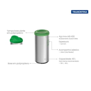 Material: Aço Inox AISI 430 Espessura: 0,4 mm Acabamento: Scotch Brite Tratamento anti digitais: Não Alça para transporte: Não Tampa: Sim, basculante Balde plástico removível: Não Capacidade: 40 L Saco de lixo recomendado: 50 - 60 L Acessórios inclusos: - 2 Adesivos: Vidro e Seco Peso Produto Com Embalagem (Kg): 2.85 | Nome do Simples no Fornecedor: Lixeira Inox Tramontina Capsula Seleta Plus Basculante Verde | Largura Produto Com Embalagem (cm): 35.5 | Produto precisa de Montagem?: Não | Comprimento do Produto (cm): 35 | Descrição do Tamanho: 35 x 70 x 3 cm | Estado de Origem: GO | Garantia em Meses: 3 | Comprimento Produto Com Embalagem (cm): 40 | Altura do Produto com Embalagem (cm): 75 | Material para Filtro: Inox | Instruções/Cuidados: Limpar com pano seco. | Conteúdo da Embalagem: 1 Produto - 1 Volume | Largura do Produto (cm): 35 | Peso do Produto (Kg): 2.65 | Altura do Produto (cm): 70 | CORES: Verde | ColorFamily: Verde | ColorSimple: Verde | 55: | MaterialFamily: Inox Ean: 7894693741066