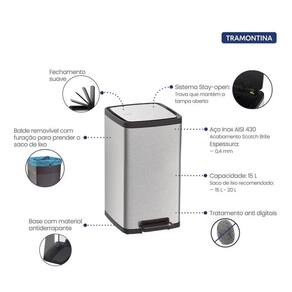 Lixeira Octus Inox Balde Removível e Pedal 15L TramontinaA lixeira Tramontina Octos com capacidade de 15 litros vai proporcionar muita praticidade e estilo na hora de organizar seus espaços. Desenvolvida em aço inox, conta com tratamento anti digital que não deixa marcas de manuseio no corpo da lixeira, possui tampa com fechamento suave e trava para quando você estiver fazendo a troca do saco de lixo no balde de plástico removível. Além de todas essas características, ela tem um design moderno e irá garantir muito mais estilo para os ambientes onde for inseridaComponentes incluídos na embalagem:Código: 9454442001- Lixeira Octos 15L Material: Aço Inox AISI 430 Espessura: 0,4 mm Medidas: A 500mm L 270mm P 350mm Acabamento: Scotch Brite Tratamento anti digitais: Sim Alça para transporte: Não Abertura: Pedal Tampa: Sim, com sistema Stay Open Fechamento suave da tampa: Sim Balde plástico removível: Sim Capacidade: 15 L Saco de lixo recomendado: 15 - 20 L Todas as imagens são meramente ilustrativas.