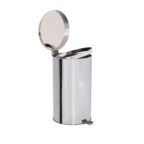 Lixeira cilíndrica com tampa e pedal, produzida em Aço inox Polido 430 e 304. Acompanha aro removível, para fixação do saco de lixo.