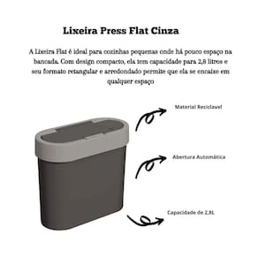 A Lixeira Flat é ideal para cozinhas pequenas onde há pouco espaço na bancada. Com design compacto, ela tem capacidade para 2,8 litros e seu formato retangular e arredondado permite que ela se encaixe em qualquer espaço. A tampa tem sistema de abertura automática e formato mais retangular, o que facilita no descarte de alimentos. O corpo possui aberturas laterais para encaixe da sacola plástica e o aro da tampa esconde a sacola, deixando o visual mais limpo. Bicolor, ela está alinhada com as tendências de Design que apresenta produtos em duas cores, permitindo combinações com diversos ambientes.