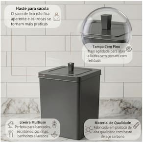 Fabricada totalmente em plástico, em formato quadrado, essa lixeira é perfeita para ser utilizada sobre a pia ou bancada de sua cozinha, banheiro ou em ambiente corporativo. Tampa com abertura manual por meio de pino, permite deixar o saquinho de lixo fixo e não aparente, já que possui um aramado interno.