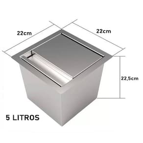 Design moderno e elegante em aço inoxidável, é resistente à corrosão e fácil de limpar. Possui tampa com fechamento suave e alavanca de abertura para facilitar o descarte de lixo. Compacta e pode ser embutida na bancada da cozinha, economizando espaço e mantendo a harmonia do ambiente. Ideal para cozinhas residenciais ou comerciais.Balde 100% em aço inox. Ideal para embutir em tampos de granito, corian, silestone, MDF ou qualquer outro tipo de bancada.Acabamento: EscovadoDimensões: 220 x 220 x 225 mm (L x C x A)