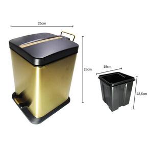 Lixeira Quadrada Dourada E Preta Em Aço Inox Com Pedal 6L Material Aço Inox e polipropileno plástico Dimensões do produto Lixeira 28x25cm Balde interno removível 22,5x19cm Capacidade 6L Peso aproximado da embalagem com produto - 2kg Revestimento Nitreto de Titânio Dourado - Não é pintura. Uma lixeira quadrada dourada e preta em aço inox com pedal, com capacidade para 6L, acabamento externo e interno emborrachado, com um balde interno removível e revestimento PVD DOURADO de alta durabilidade. Um acessório para banheiro que é portátil e prático. Agrega beleza e funcionalidade aos ambientes, pois possui um acabamento em alto brilho metálico, sem porosidades que evita o acumulo de resíduos. É higiênica e durável. Peça em aço inox de alto padrão. Para abrir basta pressionar o pedal localizado na parte inferior da lixeira. Dica Além de ser uma lixeira portátil e prática para se usar no banheiro, ela também pode ser funcional na sua cozinha. Importante Esse produto não oxida, não enferruja e nem mancha o piso ou bancada com o passar do tempo desde que as recomendações de uso sejam seguidas adequadamente . Produto altamente resistente a umidade. Contém 01 lixeira quadrada com pedal 01 balde removível 6L Recomendações de uso Use apenas sabão ou detergente e o lado macio da esponja. Outros tipos de produtos, como palha de aço, poderão riscar ou prejudicar o brilho. Enxágue bem cada peça a fim de remover totalmente os resíduos dos produtos de limpeza, que, por serem abrasivos, podem prejudicar o inox. Sempre que possível, use água morna, pois renova o brilho do produto. Após a lavagem, enxugue imediatamente o mesmo, caso contrário, as substâncias químicas da água cloro poderão causar manchas. Na lavagem manual evite atrito entre o produto durante o processo de lavagem e no armazenamento, para mantê-los sem riscos. Não recomendado também, o uso de máquina lava louças. Marca: Não Informado Ean: 7893590634457
