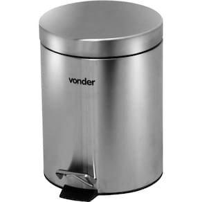 Capacidade: 5 litros | Formato: Redondo | Tipo de tampa: Inox, abertura por pedal | Dimensões: Diâmetro 260 mm / Altura 280 mm | Cor da lixeira: Cinza (Inox) | Material (tipo/composição): Aço Inox 410 | Massa aproximada (peso) (kg): 0,92 kg