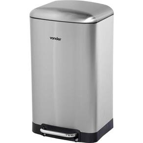 Lixeira retangular 30 litros inox cinza VONDER Fabricada em aço inox, maior resistência e durabilidade. Possui balde plástico removível com alça e abertura da tampa por pedal, com sistema de amortecimento. Possui base emborrachada, evitando que a lixeira se mova quando é acionada. Conteúdo: 1 Lixeira. Capacidade: 30 litros | Formato: Retangular | Tipo de tampa: Inox, abertura por pedal | Dimensões: Largura: 345 mm / Profundidade: 325 mm / Altura: 620 mm | Cor da lixeira: Cinza (Inox) | Material (tipo/composição): Aço Inox 410 | Massa aproximada (peso) (kg): 3,85 kg