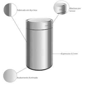 Com abertura automática da tampa devido a um sensor infravermelho, tem a praticidade de não precisar encostar as mãos para depósito de resíduos.