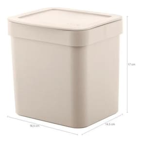 Dimensões da Lixeira: 16,5cm C x 14,5cm L x 17cm A Altura da lixeira com tampa aberta: 30,5cm Dimensões do Suporte: 7,3cm C x 2cm L x 7,3cm A Capacidade da Lixeira: 2,5 Litros Com Suporte de Fixação para Parede Acompanha: 2 buchas e 2 parafusos.