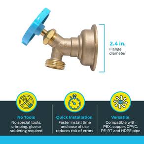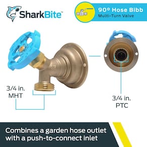 Llave de paso SharkBite 3/4 x 3/4 pulg. MHT con codo de 90 grados, multi-vuelta, para unión rápida en latón, compatible con tuberías PEX, cobre, CPVC, PE-RT y HDPE, modelo 24627LF. - LLAVE DE PASO SHARKBITE DE 90 GRADOS: Válvula de cierre multi-vuelta con brida de montaje y entrada, ideal para regular flujo de agua en espacios reducidos; combina salida para manguera de jardín de 3/4 pulg. con entrada push-to-connect de 1/2 o 3/4 pulg. - VERSÁTIL: Las llaves de paso de latón con conexión push funcionan bien con tuberías PEX, CPVC, PE-RT, SDR-9 HDPE y cobre; posee una brida de montaje y conexión de entrada patentada de 2.4 pulgadas de diámetro. - FÁCIL DE INSTALAR: Diseño innovador para instalación rápida y sencilla sin herramientas, engarces, pegamento ni soldadura; apta para líneas húmedas; se retira con clip desconector o pinzas desconectadoras. - PREFERIDO POR PROFESIONALES: Las herramientas y accesorios SharkBite cumplen altos estándares para aplicaciones de plomería comercial y residencial, combinando durabilidad y facilidad de uso; ideal para reemplazos y nuevas instalaciones. - HECHO EN ESTADOS UNIDOS: Todas las válvulas, clips, juntas y adaptadores SharkBite son fabricados y probados en USA.