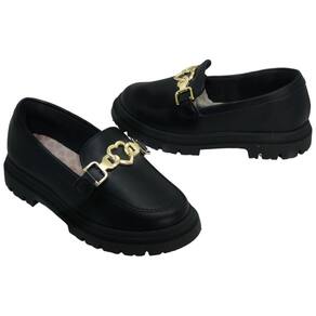 O design do Loafer apresenta um perfil clássico, com um bico arredondado e um recorte elegante no peito do pé. Ele é especialmente projetado para se ajustar ao pé das meninas com conforto e estilo. A característica mais marcante deste Loafer é sua sola tratorada. Esta sola robusta e aderente não apenas proporciona uma ótima tração, tornando-o adequado para várias atividades, mas também adiciona um toque moderno e arrojado ao design tradicional do Loafer.