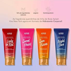 As fragrâncias queridinhas da linha de Body Splash Kiss New York agora em formato de Hidratante Corporal A Loção Hidratante Corporal da Kiss New York contém hemiesqualano, ativo que proporciona hidratação intensa e prolongada, fórmula vegana e feita com 92% de ingredientes naturais.