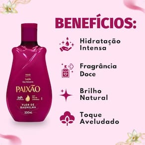 Com sua fórmula enriquecida com óleo de amêndoas, a Loção Deo Hidratante Paixão Flor de Baunilha garante hidratação por até 24 horas e possui ação desodorante. A fragrância envolvente combina a doçura de frutas vermelhas como framboesa, amora silvestre, mirtilo e morango frescos com um buquê cremoso de rosa e jasmim, finalizando com notas caramelizadas, doces e amadeiradas. É a solução ideal para manter a pele nutrida, protegida e com um aroma irresistível ao longo do dia.