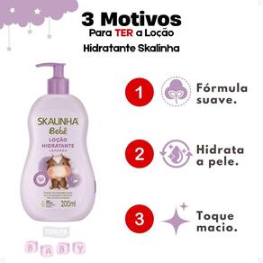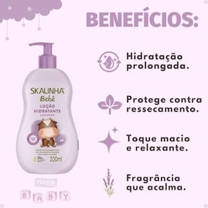 Com uma fórmula hipoalergênica, livre de parabenos, petrolato, óleo mineral e corantes, a Loção Hidratante Skalinha Bebê Lavanda proporciona um toque macio e um aroma relaxante de lavanda, ideal para a rotina de cuidados do seu pequeno.
