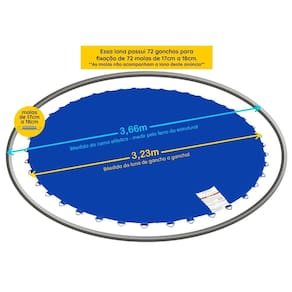 Essa Lona de Salto possui 3,23m de diâmetro e já vem com 72 ganchos fixados para molas de 17cm a 18cm. Portanto: