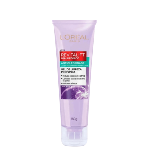 Gel de limpeza antioleosidade. L'Oréal Paris Revitalift Hialurônico limpa profundamente a pele, removendo o excesso de oleosidade.
