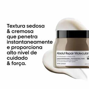 L'oréal Professionnel Absolut Repair Molecular Máscara 500ml Absolut Repair Molecular: Reviva seus cabelos em nível molecular Cabelos danificados e sem vida A Máscara Concentrada Absolut Repair Molecular é a solução que você procura Com sua fórmula inovadora, ela repara profundamente os danos, restaurando a fibra capilar e deixando seus cabelos mais fortes, brilhantes e saudáveis. Por que escolher a Máscara Absolut Repair Molecular 500ml