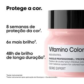 Se você tem cabelos coloridos e quer mantê-los radiantes e saudáveis, o Kit L'Oréal Professionnel Serie Expert Vitamino Color é a solução perfeita Composto por um shampoo de 300ml e uma máscara de 250g, este kit oferece uma limpeza suave que protege a cor, hidrata profundamente e garante um brilho intenso aos seus fios. Diga adeus ao desbotamento e conquiste um cabelo colorido cheio de vida Imagine ter um kit completo que cuida da cor do seu cabelo como um profissional. O shampoo limpa delicadamente, protegendo até as cores mais sensíveis, enquanto a máscara hidrata, protege e intensifica o brilho. Ambos os produtos são enriquecidos com Resveratrol, um poderoso antioxidante presente na uva, que protege e potencializa a cor, garantindo 8 semanas de proteção e 7x mais brilho.