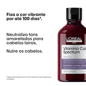 Vitamino Color Spectrum Shampoo Neutralizador De Tons Amarelados Profissional De L'Oréal Professionnel, Formulado Com Pigmentos Roxos E Agentes De Tratamento. A Tecnologia Ajuda A Fixar Os Pigmentos Na Fibra Capilar Para Fixar A Cor Vibrante Do Dia 1 Por Até 100 Dias. Resultados Em 5 Dimensões Da Cor:1. Brilho: Brilho Espelhado Ultraintenso . 2. Saturação: Cores Ricas E Vibrantes. 3. Contraste: Percepção Ideal Entre Múltiplos Tons. 4. Tom: Reflexos Indesejados Neutralizados. 5. Luminosidade: Níveis De Luminosidade E Profundidade São Bem Preservados. A Fórmula Cremosa Roxa Neutraliza Instantaneamente Subtons Amarelados Indesejados Para Cabelos Loiros. O Cabelo Fica Limpo E Nutrido. Teste Instrumental Com A Linha Completa Vitamino Color Spectrum Teste Instrumental Com A Linha Completa Vitamino Color Spectrum Após 4 Semanas. itens Inclusos:1- L'Oréal Profissional Vitamino Spectrum Shampoo 300ml. Marca: Não Informado Ean: 3474637268398
