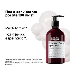 Vitamino Color Spectrum Condicionador Profundo De L'Oréal Professionnel, Formulado Com Ácido Ferúlico + Ácido Cítrico 2,5%. A Tecnologia Ajuda A Fixar Os Pigmentos Na Fibra Capilar Para Fixar A Cor Vibrante Do Dia 1 Por Até 100 Dias. Resultados Em 5 Dimensões Da Cor:1. Brilho: Brilho Espelhado Ultraintenso . 2. Saturação: Cores Ricas E Vibrantes. 3. Contraste: Percepção Ideal Entre Múltiplos Tons. 4. Tom: Reflexos Indesejados Neutralizados. 5. Luminosidade: Níveis De Luminosidade E Profundidade São Bem Preservados. A Fórmula Ultra Hidratante Cria Uma Espuma Densa Que Limpa A Fibra Capilar Completamente Para Um Cabelo Instantaneamente Nutrido E Mais Forte. Teste Instrumental Com A Linha Completa Vitamino Color Spectrum Teste Instrumental Com A Linha Completa Vitamino Color Spectrum Após 4 Semanas. itens Inclusos:1- L'Oréal Vitamino Spectrum Condicionador 500ml. Marca: Não Informado