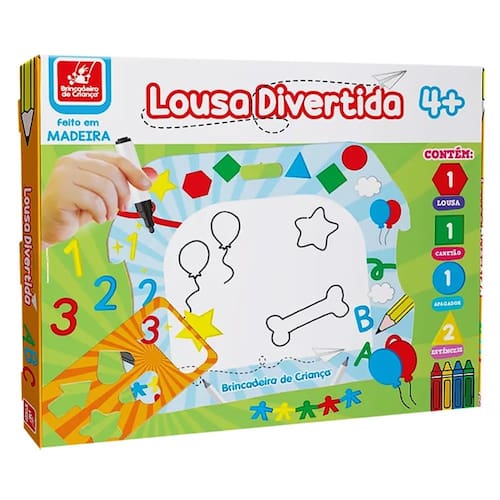 Lousa para as crianças se divertirem por horas, além dos desenhos a mão livre, a criança pode também desenhar de maneira guiada com a ajuda dos dois estênceis que acompanham o produto. Desenhe, apague e repita. Contem 1 Lousa em madeira, 2 estênceis, 1 canetão e 1 apagador.