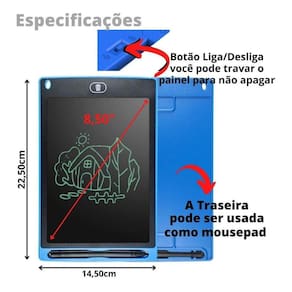 Essa é a maneira mais divertida de aprender desenhar e escreverlousa magica tablet para diversão e aprendizado de crianças e anotações,também pode ser utilizada para exemplificações, reuniões e brincadeiras.Este tablet de desenho de lcd e abs de 8,5 polegadas é leve, fino e portátil. É fácil de transportar e não causa qualquer radiação que possa prejudicar os olhos. Adequado para muitas ocasiões, peso leve, fácil de transportar, reutilizável. O produto suporta uma tela de bloqueio de botão, uma função de tela clara de botão e baixo consumo de energia. O uso do produto é muito conveniente, não há necessidade de tinta, economia de energia e proteção ambiental.A vida útil de sua bateria é de aproximadamente 2 anos.Para fins de escrita. É perfeito para deixar notas para outros membros da sua família, ou você pode dar para seu filho usar uma ferramenta de desenho. Ele diminui a necessidade de papel para rabiscos simples, listagem ou computação manual.Uso sem tinta e sem complicações. Ele vem com sua própria caneta para escrever e desenhar. A placa em si é sensível à pressão, por isso não exige muito esforço para usar e limpa sua tela com a operação de um único botão.Versátil. A parte de trás deste tablet funciona como um mousepad. É o melhor substituto para os mousepads habituais que ficam sujos e desgastados com o tempo.Economia de energia. Este tablet usa menos energia de uma bateria de célula botão substituível do que outros tablets.Especificações:material: plásticotamanho: 22,50 x 14,50cmcor: de acordo com a disponibilidade do anúnciocontém no anúncio1 x lousa mágica tela lcd1 x caneta para ser usada na lousa mágica Homologação Inmetro: ABCP-BRI-0240-2021-28 Marca: Lousa Magica Educativa Ean: 7897230710747