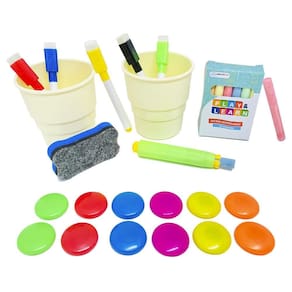 conteúdo da embalagem: 1 mesa organizadora com 2 copos, 5 canetinhas, 1 caixa com 12 unidades de giz para quadro negro, 1 porta giz, 1 apagador, 12 imãs, 1 lousa dupla face, 4 suportes azuis, 2 suportes vermelho, 2 suportes verdes e parafusos de fixação. Certificado de segurança: inmetro ce-br brics 00706-18 nm 300/2002