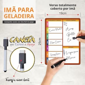 Imã importado 0,3mm Impresso em triplex 250gr Medidas aproximadas: 19cm x 25cm Caneta preta escreve e apaga Garantia: 3 mêses contra defeitos de fabricação.