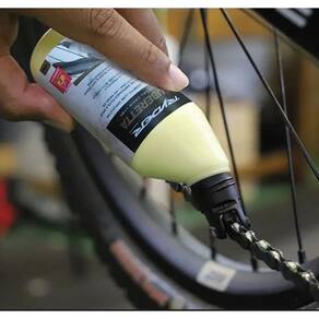 Aplicador patenteado de silicone que aplica uma gota em cada elo da corrente Sem bagunça ou desperdício Perfeitamente selado com tampa de pino para evitar obstruções e manter o lubrificante fresco Carregado com 125 ml de lubrificante de cera ryder: adequado tanto para estrada quanto para off-road em todas as condições climáticas Ecologicamente correto: lubrificante à base de água com óleo de citrinos como agente adesivo Fórmula que reduz o atrito, melhora a troca de marchas e diminui o ruído da transmissão