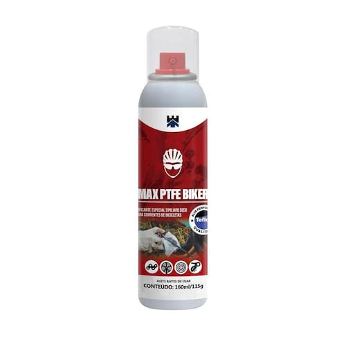 Max ptfe biker lubrificante seco indicado para a lubrificação de correntes de bicicletas. Sua formula possui rápida evaporação, formando um filme branco sintético que proporciona maior durabilidade na limpeza da corrente evitando a absorção de areias, poeiras e outros contaminantes.Aplicações: indicado para a aplicação em correntes, desviadores, deslocadores, cabos e pontos de articulação do freio.Modo de uso: agite bem antes de usar. Aplique o produto na corrente previamente limpa e deixe o produto secar naturalmente.Precauções: mantenha fora do alcance das crianças. Não exponha a temperaturas superiores a 50c.Conteúdo: 160ml/115g