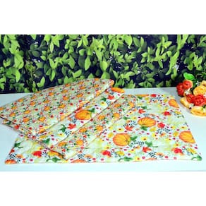 Lugar americano dupla face fabricado em tecido matelado e estampado, com estampa de abóboras e flores, com fundo branco e tons de amarelo, laranja e verde, sendo de um lado com estampas maiores e do outro lado estampas menores.
