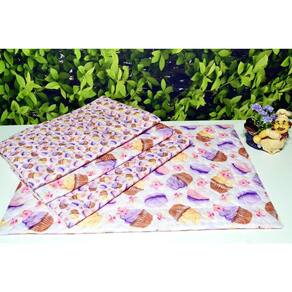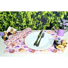 Lugar americano dupla face fabricado em tecido matelado e estampado, com estampa de cupcakes, macarons e flores, com fundo branco e com tons de bege, rosa e lilás, sendo de um lado com estampas maiores e do outro lado estampas menores.