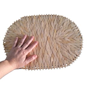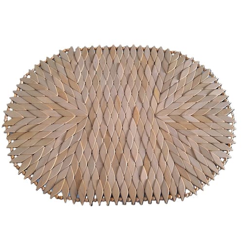 Lugar americano OVAL confeccionado em madeira, composto por peças pintadas e envernizadas, em formato de losângulo, com acabamento nas bordas.