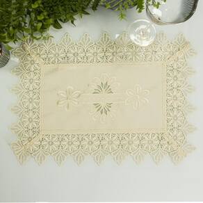 Esse produto pode ser utilizado como lugar americano, toalha de bandeja ou de várias outras formas na decoração da casa. Ele é trabalhado com renda de Guipir no mesmo tom, o que o deixa ainda mais delicado e moderno.