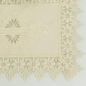 Esse produto pode ser utilizado como lugar americano, toalha de bandeja ou de várias outras formas na decoração da casa. Ele é trabalhado com renda de Guipir no mesmo tom, o que o deixa ainda mais delicado e moderno.