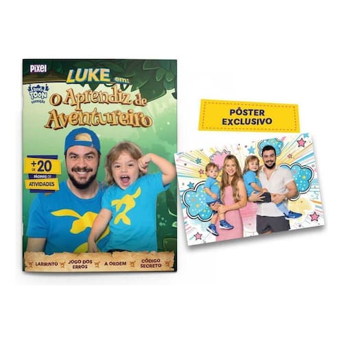 Luccas Neto está de volta e trouxe consigo uma pessoinha muito especial: seu filho Luke! O livro Luke em: O Aprendiz de Aventureiro conta a história de iniciação do filho do famoso Aventureiro Azul. Encantado com o papel de herói desempenhado pelo pai, o menino decide que quer se tornar um Aventureiro, mas descobre que essa não é uma decisão tão simples assim. Luke acredita estar preparado para enfrentar grandes batalhas ao lado do Aventureiro Azul, mas ele lhe explica que será necessário todo um preparo e treinamento para que um dia ele possa assumir esse importante posto. Inconformado, o menino desobedece às orientações dadas pelo pai, decide ir atrás dele em uma missão e acaba se metendo em uma grande enrascada na Floresta do Perigo. Diante dos vilões e do enorme medo que sentiu, Luke acaba reconhecendo o seu despreparo e, após ser salvo pelo pai, aceita o convite para se tornar um Aprendiz de Aventureiro. Toda essa história é contada ao longo do livro, que está ricamente ilustrado, traz grandes ensinamentos, passatempos variados para a criança se divertir e aprender, além de um lindo pôster!