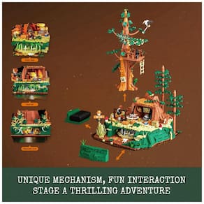 Mecanismos interativos incluem terreno que se abre para revelar armadilha de estacas, tronco giratório que alterna entre área de armadilha e caverna com tesouro, além de folhas móveis que ocultam detalhes do esconderijo. A caixa de energia do sistema de iluminação fica oculta, mas acessível, mantendo o acabamento visual da base.