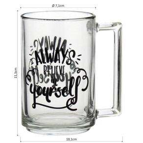 A caneca da linha A LA BONE pertence à marca LUMINARC da empresa ARC FRANCE. Ela é produzida com vidro temperado e possui uma linda estampa com os dizeres: ALWAYS BELIVE IN YOURSELF. Esse produto é ideal para bebidas quentes ou frias, pois a sua alça que propicia uma empunhadura segura.