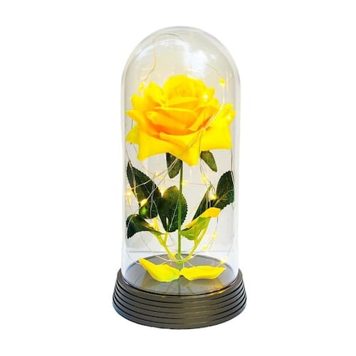 Luminária a rosa encantada amarela 20 cm base ouro quente
