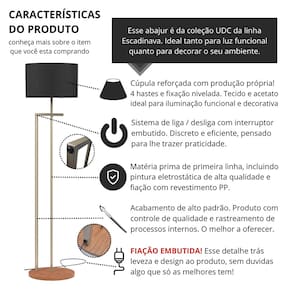 Tipo: Luminária Modelo: Salone Cor tecido: Preto Cor base: Champanhe Voltagem: Bivolt Acabamento em Pintura Eletrostática Cúpula em Acetato com Acabamento em Tecido Brugges Estrutura em Aço Carbono com Reforço 4 hastes