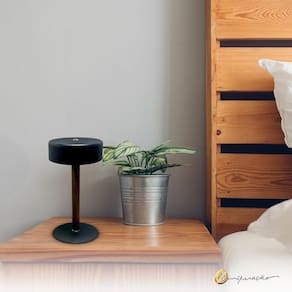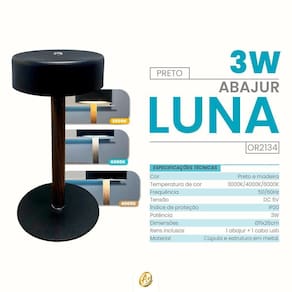 Cor: Preto e madeira Temperatura de cor: 3000K - Branco Quente/ 4000K - Branco Neutro/ 6000K - Branco Frio Frequência: 50/60Hz Tensão: DC 5V Índice de proteção: IP20 Potência: 3W Dimensões: 11x26cm Itens inclusos: 1 abajur + 1 cabo USB Material: Cúpula e estrutura em metal