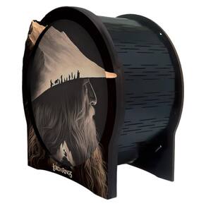 Luminária temática em MDF com estampa digital do Senhor dos Anéis Gandalf. Medindo 16x15x8cm, inclui papel especial para transpassar a luz e funciona com pilhas incluídas.