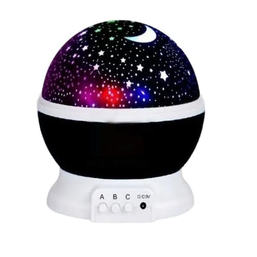 Funções dos botões Botão a - liga e desliga Botão b - troca cores de luz Botão c - efeito giratório Tampa semi-transparente podendo usar a luminária com ou sem a tampa, fazendo o céu estrelado ou apenas usando como luminária. Tamanho: 10.8 x 9.5 x 9.5 centímetros
