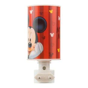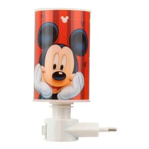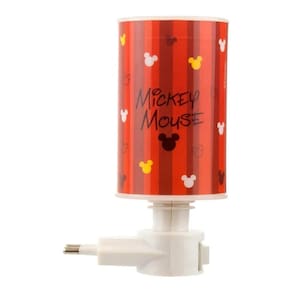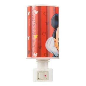 Luminária estilo abajur pequeno estampada com imagem do Mickey. Ao ligar, acende uma luz branca refletindo a luminária. Material: plástico. Bivolt