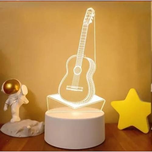 Luminária abajur violão guitarra display acrílico led 3d mesa quarto namorado luz presente mãe pai filho avo namorada Postamos em até 24hs úteis após a confirmação do pagamento. A luminária tem um lindo efeito 3d de ilusão óptica, esse efeito se torna possível devido a luz acoplada em sua base que é projetada sobre o desenho de acrílico transformando-a em um objeto 3d iluminado. Você ficará surpreso com o lindo efeito 3d visual. O desenho é feito de acrílico, gravamos e cortamos com laser de alta precisão. A base da luminária é feita de plástico abs super resistente onde fica acoplado o feixe de luz que é projetado para iluminar a peça de acrílico. As luminárias 3d são usadas para decoração de casa ou escritório, sendo também uma ótima opção para presentes é Utilizado também para compor cenários de festas, casamentos, formaturas, aniversários temáticos e muito mais Principais características: Cores da luz: luz branco quente Cor da base: branca Botão de liga e desliga Eco-friendly, usb alimentado para baixo consumo de energia. Dimensões: Tamanho aproximado da luminária: 17cm base + acrílico Tamanha da base circunferência: 10cm Tamanho da altura da base: 4 cm Carregamento: Cabo usb acoplado. Itens inclusos: 1. Peça de acrílico 1. Cabo usb acoplado a base 1. Base Os itens são enviados desmontados, ao receber, encaixe a peça de acrílico na base e conecte o cabo para ligar a luminária. Marca: Poplumos Ean: 7903769107085