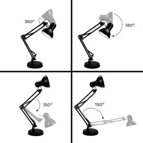 Desing, modernidade e conforto para a sua leitura A luminaria articulavel com base para mesa é ideal para você que estuda ou trabalha e preza por um ambiente mais iluminando. A luminária articulada de mesa vai lhe auxiliar, deixando o ambiente mais claro, favorecendo para a sua concentração e foco, e deixando também o ambiente com um visual mais moderno. A luminaria abajur de mesa é feita de um material de ótima qualidade e possui em sua estrutura articulações para que assim você possa dirigir o foco de luz para onde desejar. Ela é compatível com lâmpadas e27, possui um sistema bivolt e compacta. Algumas perguntas O que é luminaria articulada de mesa A luminaria articulada de mesa com base é um produto essencial para você ter em sua casa ou escritório. Ela é utilizada para auxiliar você durante os estudos, trabalho e suas leituras. Por que usar luminaria articulada de mesa A luminaria de mesa articulada ajuda a manter o foco e a concentração durante o trabalho ou estudo, pois é possível direcionar a luz para o local desejado. Ela possui bocal para lâmpadas e27, sendo compatível com lâmpadas de até 40 watts. Quais os benefícios de usar luminaria articulada de mesa A luminaria articulavel de mesa possui articulações que ajudam a movimentá-la e direcionar o a luz para onde preferir. Ela possui um corpo com altura máxima de até 68 cm auxiliando assim a luminosidade em um maior alcance. Características luminaria articulada de mesa - a luminaria articulada de mesa possui uma base estável que proporciona firmeza para a luminária - possui um bocal compatível com lâmpadas e27 - possui um de ligar/desligar, localizado na parte do fio que liga na tomada - tem um estilo clássico e material de boa qualidade - seu corpo pode ser esticado até 68 cm, aumentando assim a área de iluminação - sua base tem 15 cm de diâmetro, e sua cúpula tem de 12 cm de diâmetro. Especificações luminaria articulada de mesa Material: metal Voltagem: bivolt Lâmpadas: e27 de até 40 watts. Itens inclusos 1 luminaria articulada de mesa bivolt com base Obs: não acompanha a lâmpada Ean: 0709016976421